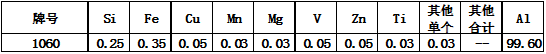產(chǎn)品介紹 1060鋁板含鋁量達(dá)99.6%,又被稱(chēng)為純鋁板,1060鋁板具有良好的延伸率以及抗拉強(qiáng)度,完全能夠滿足常規(guī)的加工要求(沖壓,拉伸)成型性高,1060熱軋鋁板被廣泛應(yīng)用于母線、燈具、標(biāo)牌、幕墻、保溫等領(lǐng)域;而1060熱軋料0.1mm厚度的鋁板卷則被應(yīng)用于汽車(chē)配件中(如:動(dòng)力電池軟連接)。 化學(xué)成分 產(chǎn)品特性